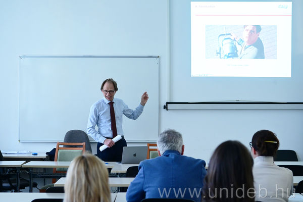Mérő László matematikus, publicista, pszichológus, játékfejlesztő, az ELTE Pszichológiai Intézet és a Babeș–Bolyai Tudományegyetem professzora tart előadást a Debreceni Egyetem Műszaki Karán.